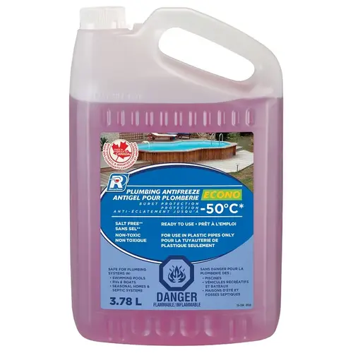 Econo plumbing anti-freeze provides burst protection down to -50 deg C when used undiluted. It has been specifically formulated to protect and prevent freeze damage to drains and fresh water lines in septic systems, boats, recreational vehicles, seasonal homes, swimming pool filtration and heating systems. It is safe for plastic piping only. The plumbing anti-freeze is a mixture of propylene glycol, alcohols and water. It is completely non-toxic and if used as directed, it is not harmful to the environment.