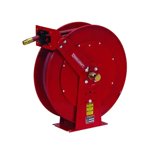 R.S. Hughes carries hose reel to keep your facility organized and safe. Reelcraft Industries includes a hose with this hose reel. The pvc hose is 50 ft. Reelcraft Industries created the hose reel to hold a 50 ft cable. It is important to consider the limits when purchasing a hose reel. The limits for this SKU are: 250 psi and 150 F. Designed to be used for Air/Water. Consider these attributes to ensure proper fit and function: 3/4 (F)NPTF inlet and 3/4 (M)NPTF outlet. The reel is powered by a Spring. Constructed from steel and comes in red. California Proposition 65: WARNING: Cancer and Reproductive Harm