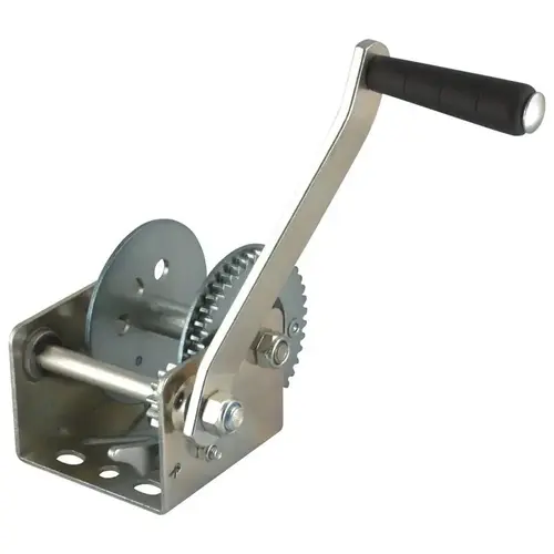 One-way ratchet, 6 in handle, 5/8 in hub. 4:1:1 gear ratio. Includes comfort-grip handle for a positive hold while cranking. Zinc-plated finish for great corrosion resistance. Heavy-duty rib reinforced frames maintain proper gear alignment. Full-length drum bushing and oil impregnated shaft bushings minimize scheduled maintenance. High carbon SAE 1050 steel gears to resist wear and last longer. Mounting hardware sold separately.