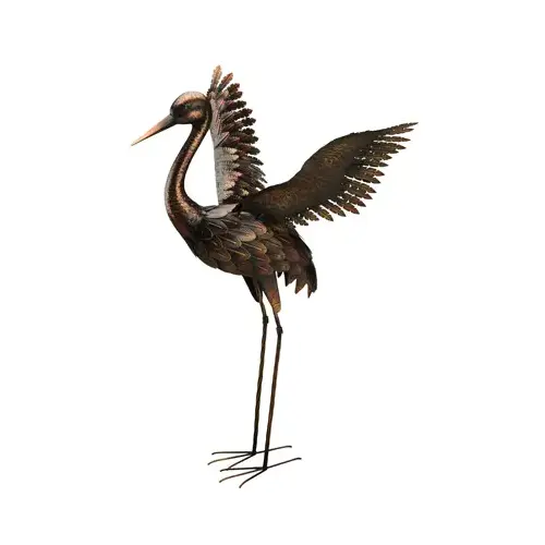 41", Bronze Crane, Bird Statue, Crane Standing Art, Wings Up, Metal, Handcrafted Designs Painted In Bronze Color, Powder Coated, Self Standing, 6" Ground Stake Included, Legs Detach For Easy Shipping.
