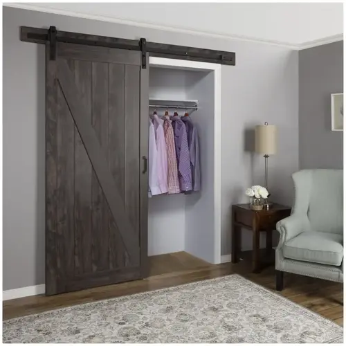 Cheval Z design in Iron Age finish, pre-finish barn door which requires no priming, painting or staining. Barn door kit includes: Rustic Matte black hardware, track, handle, matching backer board and barn door. Trackless door design keeps floor opening clear an hazard free. Ready-to-assemble, pre-drilled mounting holes and bottom-groove guide. Fit openings between 28"-34" wide and opening height of 80-1/2". Actual Panel: 36" x 84" x 1-3/8".