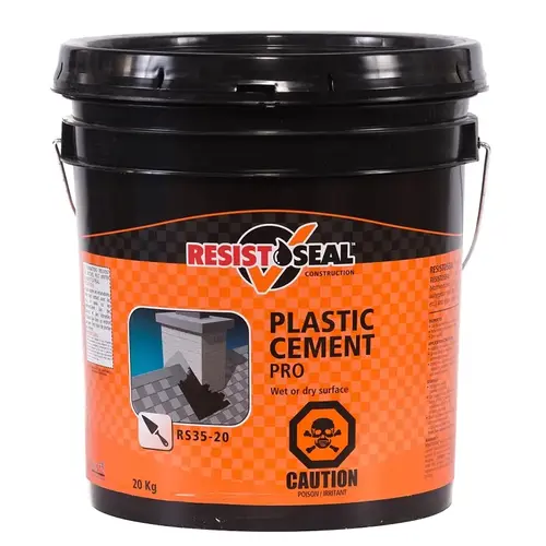Resistoseal pro plastic cement is an all-purpose black mastic composed of bitumen, fibers and mineral fillers with a low level of solvent. It is used to fill and repair holes and cracks, it adheres to most materials without primer. Its formulation offers good resistance to temperature variations and is designed to be applied at low temperatures.