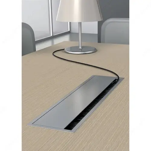 Rectangular cable outlet in aluminum with straight flap cover, black brushed seal, and smooth-closing functionality.