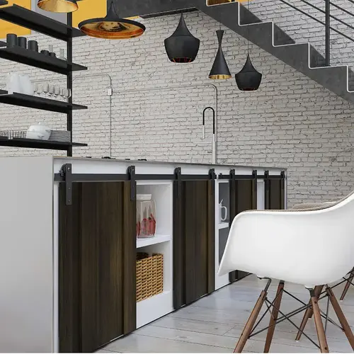 The GURT is a top running decorative sliding system for mini barn-style doors weighing up to 55 lb (25 kg) each.