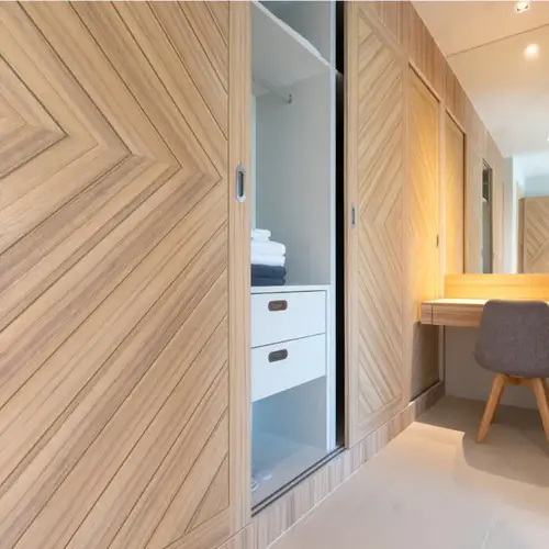 The SLIDE 50 sliding cabinet wood door system has a concealed low profile for inset applications with a door weight capacity of 110 lb (50 kg) each.