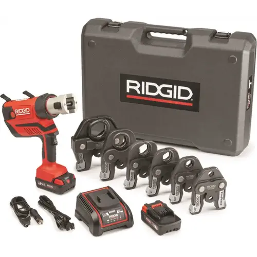 The RIDGID RP 350 with 1/2 in. to 2 in. ProPress Jaws features a brushless motor that requires no scheduled maintenance, capable of over 100,000 press cycles. Get access to hard-to-reach locations with the industry-first endless 360° swivel. With the most advanced LED lighting and color-coded status indicators, the RP 350 provides you with efficiency and confidence. The tool is 5% lighter and 3 in. shorter than its predecessor. Weighing only 8 lbs. with the battery and having an ergonomic forward handle for balance and control, the RP 350 provides the option of a press tool with less user fatigue and pipe connections that are quick and safe. The RP 350 is also smart. The Bluetooth-enabled tool can pair with the RIDGID Link app to track tool usage, battery life, last known location and service needs. This kit comes with 6 jaws to press 1/2 in. to 2 in. copper tubing, a 18-Volt Advanced Lithium Ion 2.5 AmH Battery and charger. The RP 350 is also compatible with other attachments that can press additional sizes and materials The RP 350 is compatible with all RIDGID Standard Series press jaws, rings, actuators and attachments making it extremely versatile.