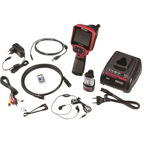Documentation is made easy with the RIDGID Micro CA-350 Inspection Camera. The CA-350 drain camera easily records still images and videos of problems in hard-to-reach areas while saving them on the internal memory (235 MB) or the included 8 GB SD card. The plumbing camera snake features a comfortable pistol-grip design, large screen and rugged anodized aluminum camera head with 4 bright LEDs make it easy to detect and diagnose the unreachable. Get the perfect view with enhanced features like image rotation and digital zoom. Besides the rechargeable 12-Volt Lithium-Ion battery, the micro CA-350 plumbing camera can also be powered with the included AC adapter which is ideal for time consuming inspection jobs or when you simply run out of battery. Includes micro CA-350 hand-held inspection camera with 17 mm imager with 3 ft camera reach included, battery, charger, USB cable, hook, magnet and mirror accessories, RCA cable, AC adapter, headset with microphone and 8 GB SD card.