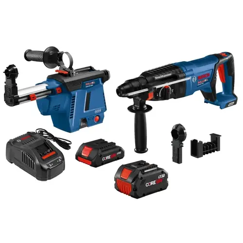 Includes: (1) GBH18V-26 18V EC Brushless SDS-plus Bulldog 1 in Rotary Hammer 2) GBA18V63 18V CORE18V Lithium-Ion 6.3 Ah Batteries (1) GDE18V-16 SDS-plus Dust Collection Attachment (1) 18V Fast Charger (1) Auxiliary Handle (1) Depth Gauge (1) Carrying Case