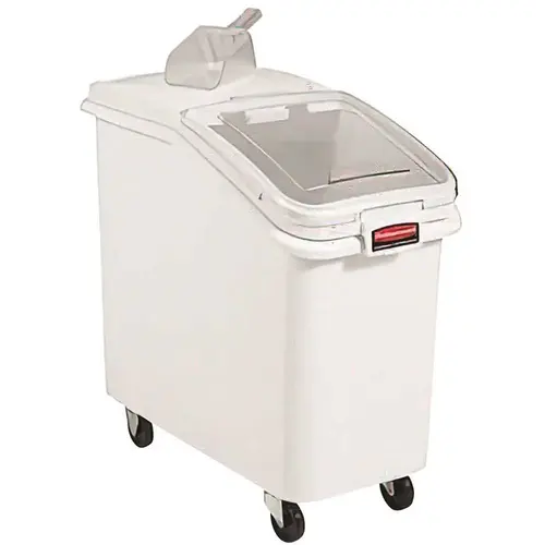 Rubbermaid Commercial Prosave Wheeled Ingredient Bin W/ 32 Ounce Scoop (White). Integrated Lid: Easy Access To Food With A Secure Lid For Storage. 32-Ounce Scoop: Includes a large 32-ounce scoop for easy ingredient measuring. Scoop Hanger: Built-in scoop hanger for better food safety and hygiene. Space-Saving Design: Rectangular shape helps save space in storage areas. Hygienic: Easy-to-clean design ensures a sanitary food storage solution. Slanted Front: Sliding opening allows quick and easy ingredient access. Mfg #FG360288WHT