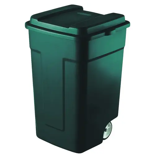 This trash can's durable, shatterproof material withstands severe weather conditions, the heavy-duty large wheels make trash day less strenuous, it has an exceptionally strong, mold-in handle, it is an industrial strength trash can with a snap-fit lid.