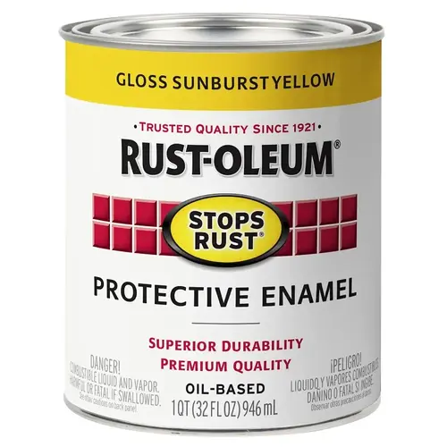 RUST-OLEUM Stops Rust Protective Enamel Paint, Brush-On, Low VOC, 1 qt Net Content, Solvent-Like Odor/Scent, Sunburst Yellow, Gloss Sheen, 25 to 50% 1-Chloro-4-(Trifluoromethyl)Benzene, 10 to 25% Octamethylcyclotetrasiloxane, 10 to 25% Titanium Dioxide, 2.5 to 10% Nanoscale Titanium Dioxide, 1 to 2.5% Hydrotreated Light Distillate, 1 to 2.5% Carbon Black, 1 to 2.5% Xylenes (o-, m-, p- isomers), 0.1 to 1% Methyl Ethyl Ketoxime, 0.1 to 1% Methyl n-Amyl Ketone, 0.1 to 1% Ethylbenzene, 0.1 to 1% Solvent Naphtha, Light Aromatic, 0.1 to 1% Cobalt 2-Ethylhexanoate, 0.1 to 1% Naphtha, Hydrotreated Heavy Compositions, 1.152 Specific Gravity, 100 deg F Flash Point, <100 g/L VOC, 80 to 175 sq-ft Coverage Area, Brush, Roller, Spray Gun Application Method, Applicable Materials: Brick, Concrete, Masonry, Metal, Stone, Wood, 2 to 12 hr Drying, 136 to 5432 deg C Boiling Point, Flammability: 2, Oil Base