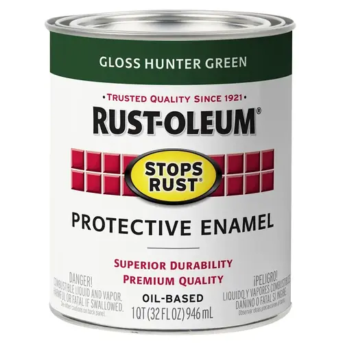 RUST-OLEUM Stops Rust Protective Enamel Paint, Brush-On, Low VOC, 1 qt Net Content, Solvent-Like Odor/Scent, Hunter Green, Gloss Sheen, 25 to 50% 1-Chloro-4-(Trifluoromethyl)Benzene, 10 to 25% Octamethylcyclotetrasiloxane, 10 to 25% Titanium Dioxide, 2.5 to 10% Nanoscale Titanium Dioxide, 1 to 2.5% Hydrotreated Light Distillate, 1 to 2.5% Carbon Black, 1 to 2.5% Xylenes (o-, m-, p- isomers), 0.1 to 1% Methyl Ethyl Ketoxime, 0.1 to 1% Methyl n-Amyl Ketone, 0.1 to 1% Ethylbenzene, 0.1 to 1% Solvent Naphtha, Light Aromatic, 0.1 to 1% Cobalt 2-Ethylhexanoate, 0.1 to 1% Naphtha, Hydrotreated Heavy Compositions, 1.152 Specific Gravity, 100 deg F Flash Point, <100 g/L VOC, 80 to 175 sq-ft Coverage Area, Brush, Roller, Spray Gun Application Method, Applicable Materials: Brick, Concrete, Masonry, Metal, Stone, Wood, 2 to 12 hr Drying, 136 to 5432 deg C Boiling Point, Flammability: 2, Oil Base