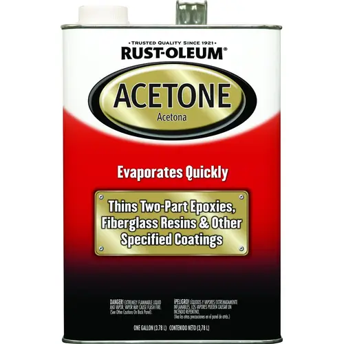 Easily thin two-part epoxies and fiberglass resins with RUST-OLEUM automotive acetone, the strongest and fastest-evaporating solvent available. This special-purpose thinner also softens a wide range of materials, including plastic, plexiglass, glue and tar.