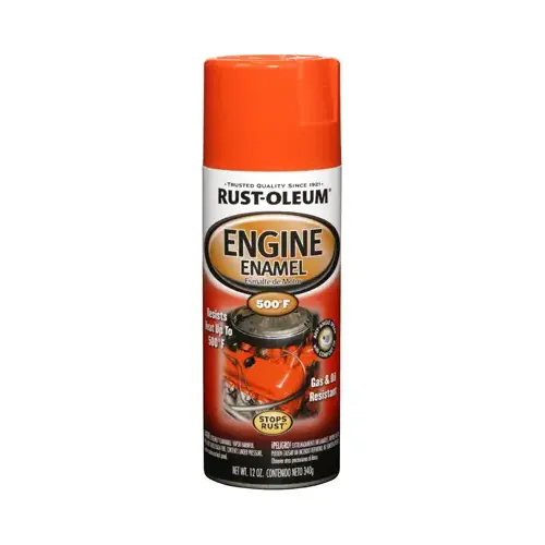 RUST-OLEUM Engine enamel is formulated to create a smooth finish on automotive engines and other automotive surfaces which reach intermittent temperatures up to 500 deg F (260 deg C). Engine Enamel features an advanced spray system that allows you to spray at any angle, even upside down for those hard-to-reach areas. A comfort spray tip with a wider finger pad reduces fatigue caused by continuous spraying.