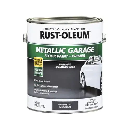 RUST-OLEUM Metallic garage floor paint plus primer is a ready-to-use interior and exterior concrete floor paint specially formulated for use on garages, carports, driveways, basements, porches, patios, walkways and pool decks. Two coats of this self-priming concrete floor paint saves time and money and RUST-OLEUM's acrylic formula resists damage from hot tires, motor oil, grease and gasoline. The durable, UV and weather-resistant, brilliant, metallic finish is easy to maintain and resists fading and peeling and can be easily cleaned up with soap and water.