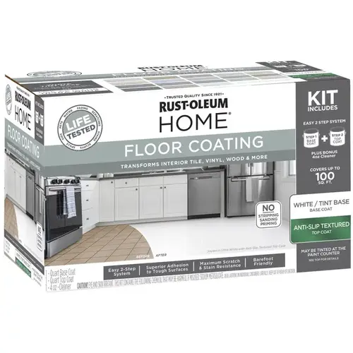 Rust-Oleum HOME Floor Coating Kit is an easy-to-use, revolutionary technology for a variety of indoor surfaces. This cost-effective, water-based paint transforms the appearance of outdated floors without the cost of replacing it. This long-lasting tintable formula is ideal for multiple rooms in the house including basements, bathrooms, kitchens, laundry rooms and more. Easy soap and water cleanup.
