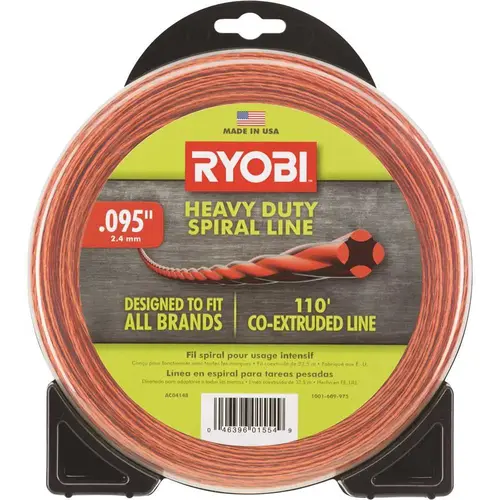 To easily and effectively slice through thick grass and weeds, the RYOBI Heavy-Duty 0.095 in. x 110 ft. spiral line is the perfect product. This line is optimized for use with gas string trimmers and is designed for heavy-duty use. Its spiral or co-extruded design helps increase your trimmer's efficiency while increasing resistance to breaks and wear. With 110 ft. of line, you'll be prepared for the season ahead.