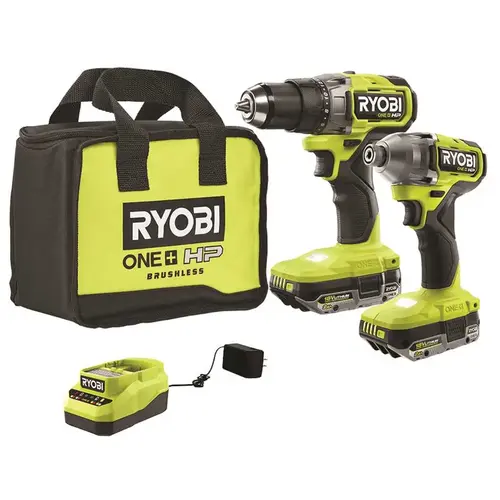 The RYOBI 18V ONE+ HP Brushless line of products is redefining power and performance. The RYOBI 18V ONE+ HP Brushless 2-Tool Combo Kit includes a 1/2 in. Drill/Driver, 1/4 in. Impact Driver, (2) 18V 2.0 Ah High Performance batteries, charger, and tool bag. The 1/2 in. Drill/Driver features a brushless motor, delivering up to 20% faster drilling and up to 50% more torque saving time and energy per application. Its 750 in./lbs. of torque maximizes output power when drilling through tough materials. This drill includes a two-speed gearbox (0-500 and 0-2,100 RPM) and a 24-position clutch for ultimate control, and is paired with a 1/2 in. ratcheting metal chuck for increased durability and accessory retention during heavy duty applications. The 1/4 in. Impact Driver features a brushless motor delivering up to 25% faster driving. The brushless motor delivers up to 2,200 in./lbs. of torque, providing this tool the power to drive longer fasteners through tough materials. It features one-handed bit release for quick bit changes and the on-board LED worklight ensures your workspace is always illuminated. Best of all, it is part of the RYOBI ONE+ System of over 175 cordless tools that all work on the same battery platform. This 2-Tool Combo Kit is backed by the RYOBI 3-Year Manufacturer's Warranty and includes an 18V ONE+ HP Brushless 1/2 in. Drill/Driver, an 18V ONE+ HP Brushless 1/4 in. Impact Driver, (2) 18V 2.0 Ah High Performance Batteries, charger, bag, and operator's manuals.