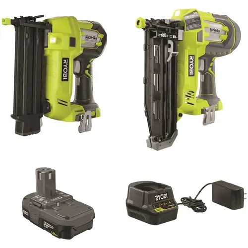 RYOBI introduces the 18V ONE+ AirStrike 18-Gauge Brad Nailer and 16-Gauge Straight Finish Nailer Kit with 1.5 Ah Battery and Charger. The 18V ONE+ AirStrike 18-Gauge Brad Nailer features AirStrike Technology, which eliminates the need for noisy compressors, bulky hoses, or expensive gas cartridges. This means faster setup and easier maneuvering on the job site. The RYOBI AirStrike Brad Nailer drives 18-Gauge nails from 5/8 in. to 2 in. long. The 18V ONE+ Lithium-Ion Cordless AirStrike 16-Gauge Cordless Straight Finish Nailer also features AirStrike Technology, and drives 16-Gauge finish nails ranging from 3/4 in. to 2-1/2 in. long. The battery features lithium-ion battery cells, providing users with up to 1.5X more runtime than Ni-Cd counterparts. The battery is engineered to deliver fade-free power for maximum performance. Best of all, this kit is part of the RYOBI ONE+ System of over 175 cordless tools that all work on the same battery platform. Backed by the RYOBI 3-Year Manufacturer™s Warranty, this kit includes an 18V ONE+ AirStrike 18-Gauge Brad Nailer with belt clip and sample nails, an 18V ONE+ AirStrike 16-Gauge Straight Finish Nailer with belt clip and sample nails, a 1.5 Ah Compact Lithium-Ion Battery, an 18V Charger, and an operator's manual.