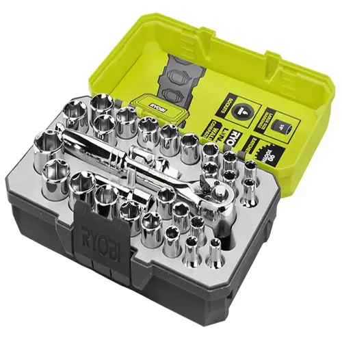 RYOBI 3/8" Drive Rachet And Socket Set With Case, 28 Piece. Quick Release 90 Tooth Ratchet Provides A 4degree Arc Swing. Large Size Markings For Quick Identification. 6 Point Sockets For Maximum Torque. The Quick Release Ratchet Allows For Efficient Socket Changes And The Chrome Finish Resists Corrosion. Mfg #RHMTS22801
