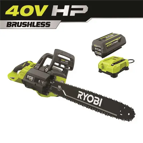 The RYOBI 18 in. 40V HP Chainsaw is the perfect combination of power and convenience. This chainsaw has all the power and length of a gas chainsaw with less maintenance. The combination of a 40V 5.0 Ah battery and Brushless Motor deliver the fast cutting speed and torque you would expect from a gas model. This chainsaw features an adjustable automatic oiler, side access chain tensioning, and on-board tool storage for the most convenient operation and easy adjustments. The mechanical chain brake is a safety feature on the chainsaw that helps prevent kickback. When the job is complete, store the chainsaw in the durable chainsaw carrying case for easy transportation and storage. The included 40V rapid charger, charges your RYOBI 40V batteries 4X faster than the standard charger. The RYOBI 18 in. 40V HP Chainsaw, batteries, and rapid charger are all compatible with 85+ RYOBI 40V products. This tool is backed by a 5-Year Tool Warranty.