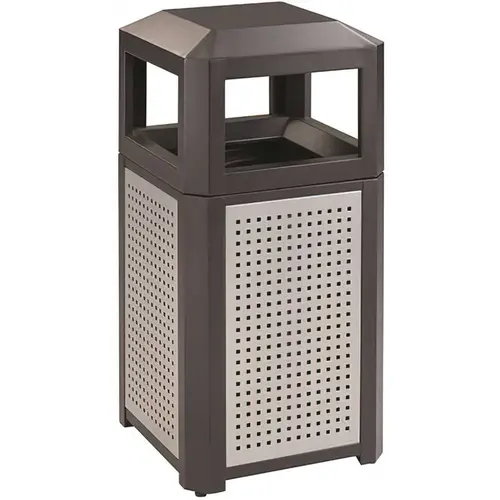 Safco 15 Gallon Evos Series Steel Waste Container (black). Evos Series Steel Waste Container. No assembly required.. Attractive container helps manage waste and litter, indoors or out.. Durable steel frame with perforated, galvanized decorative steel panels and horizontal slat boards.. Four-sided opening.. Mfg #9932BL