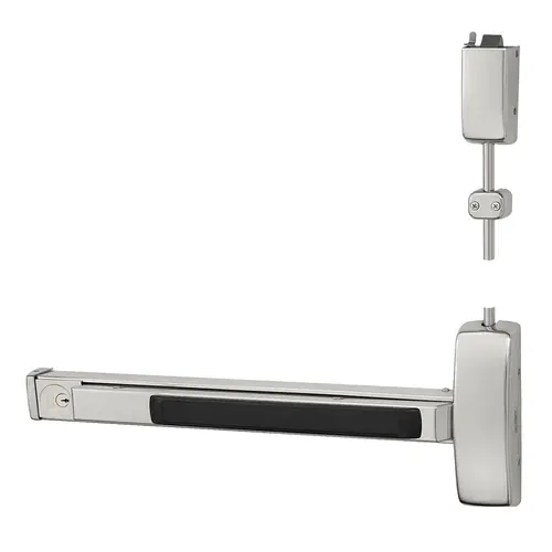 Grade 1 Surface Vertical Rod Exit Device, Wide Stile Pushpad, 32" Device, 84" Door Height, Storeroom Function, A Lever with Escutcheon, Less Bottom Rod, Cylinder Dogging, Cylinder Included, Satin Stainless Steel Finish, Left Hand Reverse