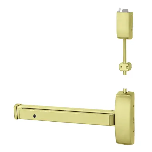 Grade 1 Surface Vertical Rod Exit Device, Wide Stile Pushpad, 32" Device, 84" Door Height, Dummy Function, F Lever with Escutcheon, Less Bottom Rod, Hex Key Dogging, Less Lexan Push Pad Touchbar, Satin Brass Finish, Right Hand Reverse