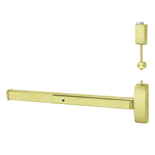 Grade 1 Surface Vertical Rod Exit Device, Wide Stile Pushpad, 48" Device, 84" Door Height, Dummy Function, Less Bottom Rod, Flush End Cap, Hex Key Dogging, Less Lexan Push Pad Touchbar, Bright Brass Finish, Right Hand Reverse