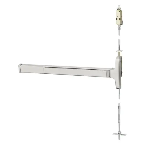 Grade 1 Concealed Vertical Rod Exit Device, Narrow Stile Pushpad, 42" Device, 120" Door Height, Storeroom Function, L Lever with Escutcheon, Electric Latch Retraction, Less Dogging, Less Lexan Push Pad Touchbar, Bright Stainless Steel Finish, Right Hand Reverse