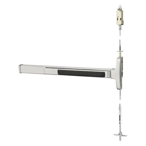 Grade 1 Concealed Vertical Rod Exit Device, Narrow Stile Pushpad, 42" Device, 120" Door Height, Storeroom Function, P Lever with Escutcheon, Flush End Cap, Electric Latch Retraction, Less Dogging, Bright Stainless Steel Finish, Left Hand Reverse