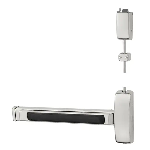Grade 1 Surface Vertical Rod Exit Device, Wide Stile Pushpad, 32" Device, 84" Door Height, Dummy Function, B Freewheeling/Vandal Resistant Lever, Less Bottom Rod, Electric Latch Retraction, Request to Exit Switch, Less Dogging, Bright Stainless Steel Finish, Right Hand Reverse