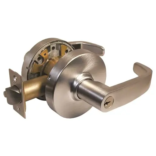 Guard bolt deadlocks latch bolt. Latch bolt by either lever unless outside lever is locked by push/turnbutton on inside lever. Pushbutton is released by key outside or lever inside. Turnbutton must be released manually. Key retracts latch bolt when outside is locked