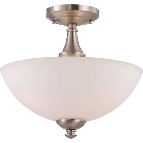 Three-Light Semi-Flush Mount. Brushed Nickel. Frosted Glass. 13 Dia X 11"H. Use 60w Max Medium Base Bulbs (Not Included). Mfg #60/5044