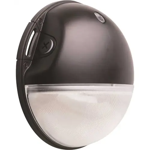 Satco LED Small Round Wall Pack, CCT Selectable, Dimmable, 20 Watt, Bronze. Dlc Premium. Integrated Bypassable Photocell. CCT Selectable. UV Stabilized Powder Coated Finish. IP65 rated. 2.5KV Surge Protection. 0-10V Dimmable. Mfg #65-751