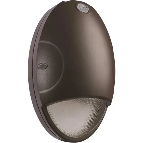 Oval Small Emergency Wall Pack LED CCT Selectable Photocell Bronze Finish. 90-minute emergency backup. Mfg #65-880