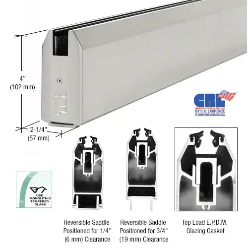 The CRL 4" (102 mm) Tapered Sidelite Rail is commonly used in office and storefront applications to secure fixed glass panels. Since the profile matches our Door Rails, these Sidelite Rails can be used top and bottom for a matching look, or with a variety of smaller configuration U-Channels. Glass is installed easily with the 'lift and drop' method using our 4" (102 mm) Aluminum and Neoprene Setting Blocks. Glass is secured with a Top Load EPDM Roll-in Glazing Gasket that eliminates the messy application of silicone sealant. Also available in this size are our 4" (102 mm) Square Sidelite Rails to match our Square Door Rails.