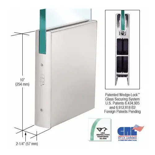 CRL Wedge-Lock Door Rail System features the exclusive CRL Wedge-Lock Securing System (U.S. Patents 6,434,905 and 6,912,818 B2, Canadian Patent 2,419,706, and European Patent No. EP 1 404 939 B1). A totally new concept for securing the glass in the door rail. It works by applying pressure from the bottom of the door rail, using two glass retaining aluminum extrusions via a flat stainless steel bar. As this bar is pulled down with socket head cap bolts, pressure is applied to the glass retaining aluminum extrusions. The bottom of the extrusions are at an angle and fit into an angled groove in the door rail. As the glass retaining extrusions are being pulled down, the angled wedge in the door rail also pulls the glass retaining extrusions together. This action, along with our specially designed door retaining gasket, creates a tremendous amount of force (more than 900 lbs.) in our 9" (228.6 mm) Corner Rail. That's 100 lbs. per inch. Imagine how much force is created in our full length 35-3/4" (908 mm) Door Rails!