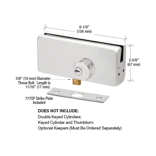 The American Style Patch Lock is a heavy-duty version of the AMR205 Lock. The taller profile housing provides additional security due to more glass being secured inside the lock housing. This lock can only be installed in top and bottom corner applications. It can be locked with either double keyed cylinders or a keyed cylinder/thumbturn which are ordered separately. A keeper is supplied with optional keepers available to accommodate most installations.