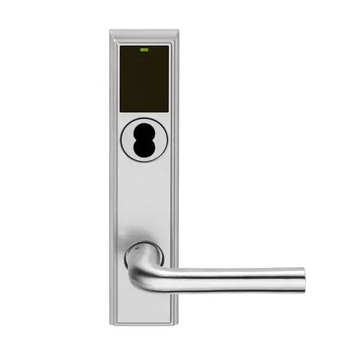 Grade 2 Schlage ENGAGE Series Wireless Mortise Lock, 2.4 GHz Bluetooth Low Energy Reader, 6-pin SFIC Prep, Less Core, Mobile Enabled Push Button and LED, 02 Lever, Addison Trim, Satin Chrome Antimicrobial Coated Finish, Right Hand
