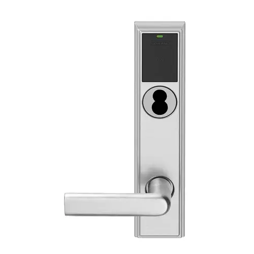 Grade 2 Schlage ENGAGE Series Wireless Mortise Lock, 2.4 GHz Bluetooth Low Energy Reader, Schlage FSIC Prep, Less Core, Mobile Enabled Push Button and LED, 01 Lever, Addison Trim, Satin Chrome Finish, Left Hand Reverse