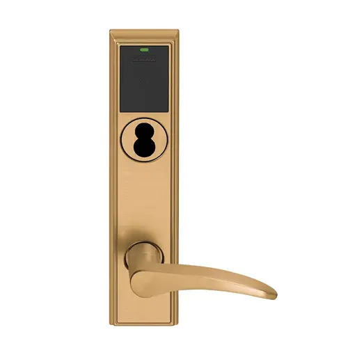 Grade 2 Schlage ENGAGE Series Wireless Mortise Lock, 2.4 GHz Bluetooth Low Energy Reader, Schlage FSIC Prep, Less Core, Mobile Enabled Push Button and LED, 12 Lever, Addison Trim, Satin Bronze Clear Coated Finish, Right Hand Reverse