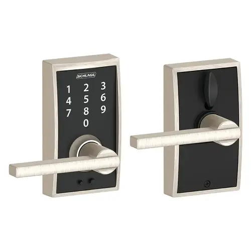 Century Style Schlage Touch Entry With Flex-Lock. Satin Nickel. Keyless Touchpad Lever. For 2-3/8 Or 2-3/4" Backset. Grade 2. 9 Volt Battery Included. Program Up To 19 User Codes. Dual Option Latch. Field-Reversible. Limited Lifetime Mechanical And Finish Warranty. Mfg #FE695 CEN 619 LAT