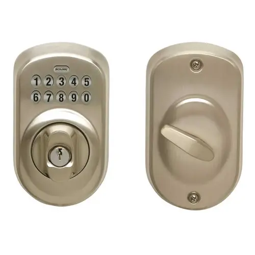 The Schlage Satin Nickel Keypad Deadbolt with Plymouth Trim is perfect for use on front doors, garage entry doors, and side and back doors. With a keypad deadbolt, you can control entry to your home more easily and securely. No more hiding keys under the doormat or losing track of copies “ just use access codes that can be created or deleted in seconds. The Plymouth trim features an oval shape and straightforward design that™s especially versatile when wrapped in our Satin Nickel finish. Plus, it™s been designed and tested with strength and durability in mind.