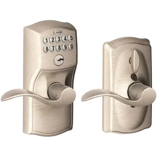 Eliminate the hassle of house keys with the Accent Satin Nickel Keypad Electronic Door Lever with Camelot Trim Featuring Flex Lock. With this electronic door lever, you can control entry to your home more easily and securely, and our Flex-Lock feature allows you to set the lock to automatically re-lock after 5-seconds of inactivity. The LED backlight keypad is able to hold up to 19 different user codes for your convenience, and features a low battery indicator. Also, this electronic keypad runs on a single 9-Volt battery, which is included. All in a slim profile and stylish trim that pairs perfectly with interior hardware. The Accent lever is widely popular for its elegant wave-like design that effortlessly matches a home's style without overshadowing it, while the Camelot trim's scalloped architectural details add charm to any home. The lever is especially versatile when wrapped in our Satin Nickel finish. Plus, it's been designed and tested with strength and durability in mind.