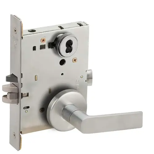 Grade 1 Classroom Mortise Lock, Schlage FSIC Less Core, 01 Lever, B Rose, Vandlgard, Satin Stainless Steel Finish, Field Reversible