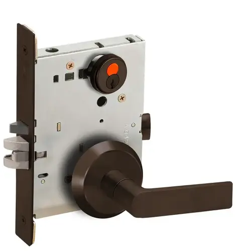Grade 1 Classroom Holdback Mortise Lock, 7-Pin SFIC Prep, With Construction Core, 01 Lever, C Rose, Vandlgard, Interior Indicator Displays "Locked/Unlocked", Aged Bronze Finish, Field Reversible