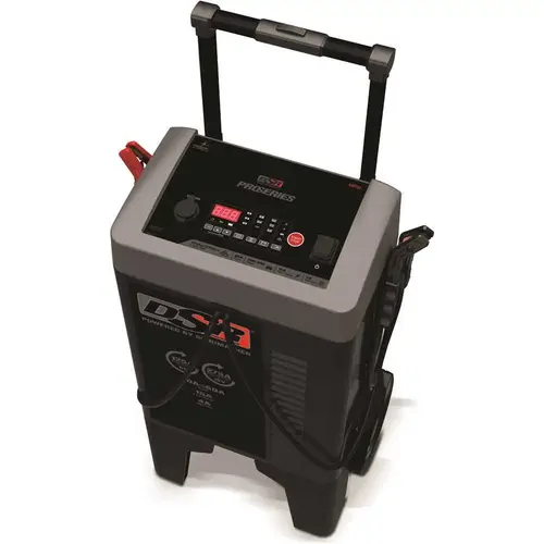 Designed for professional mechanics, Schumacher™s DSR ProSeries Line of wheeled battery chargers provides an array of superior-quality battery chargers with the power and features pros want. Experienced mechanics know that a powerful wheeled battery charger and engine starter is essential equipment and that DSR ProSeries chargers can™t be beat. The DSR ProSeries 275-Amp 6-Volt/12-Volt Wheeled Power Supply, Battery Charger, and Engine Starter (DSR122) features 275 cranking amps (12-volt) engine start, 125 cranking amps (6-volt) engine start, 20-amp-60-amp boost, 15-amp fast charge, and 4-amp maintain modes. In addition, the DSR122 features a 65-amp flash reprogram mode and a memory saver function. Fully automatic and microprocessor controlled, the DSR122 features multi-stage charging, float mode monitoring, and reverse hook-up protection. Another stand-out feature of the unit is its superior durability and construction including a heavy-duty internal transformer, rugged steel case, solid wheels, brawny copper clamps, thick 4-guage output cables, and a sturdy, retractable handle.