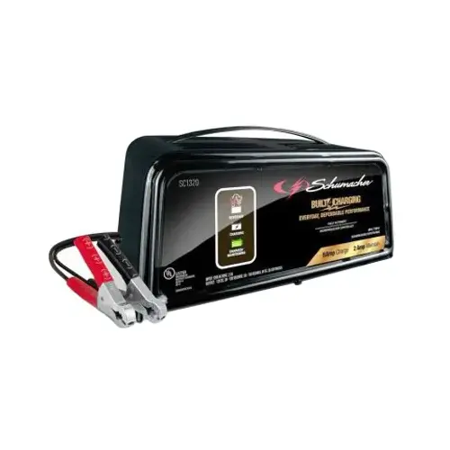 Schumacher Battery Charger, 120 VAC Input, 12 V Output, 2.2 A Input, 2 A Charging Current, Lead-Acid, 68 Ah Battery, Clip Terminal, Dimensions: 8.75 in W x 4.63 in D x 8.75 in H