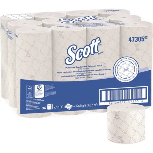Scott Pro provides state of the art solutions to maximize productivity with Scott Pro Paper Core High Capacity Bath Tissue. Now with a nearly-invisible paper core for better roll utilization, this two-ply bathroom tissue offers 10% more sheets/case than the industry standard for high-capacity standard roll bathroom tissue and twice the length of a standard roll bathroom tissue. . Waste less without disposing of a corrugate core, with a paper core dispersible in water. Also, with the new paper design, our bath tissue is Unmistakably Scott branded so you'll be recognized for providing the most well-known restroom brand in your facility. This new Elevated Scott Design was preferred 4 to 1 based upon a 2019 KCP Brand Differentiation Study. Scott Pro Paper Core Standard Roll Bathroom Tissue is the right choice for managers than want to increase cleaning staff productivity while enhancing their facility's image. Scott Pro provides state of the art solutions to maximize productivity.